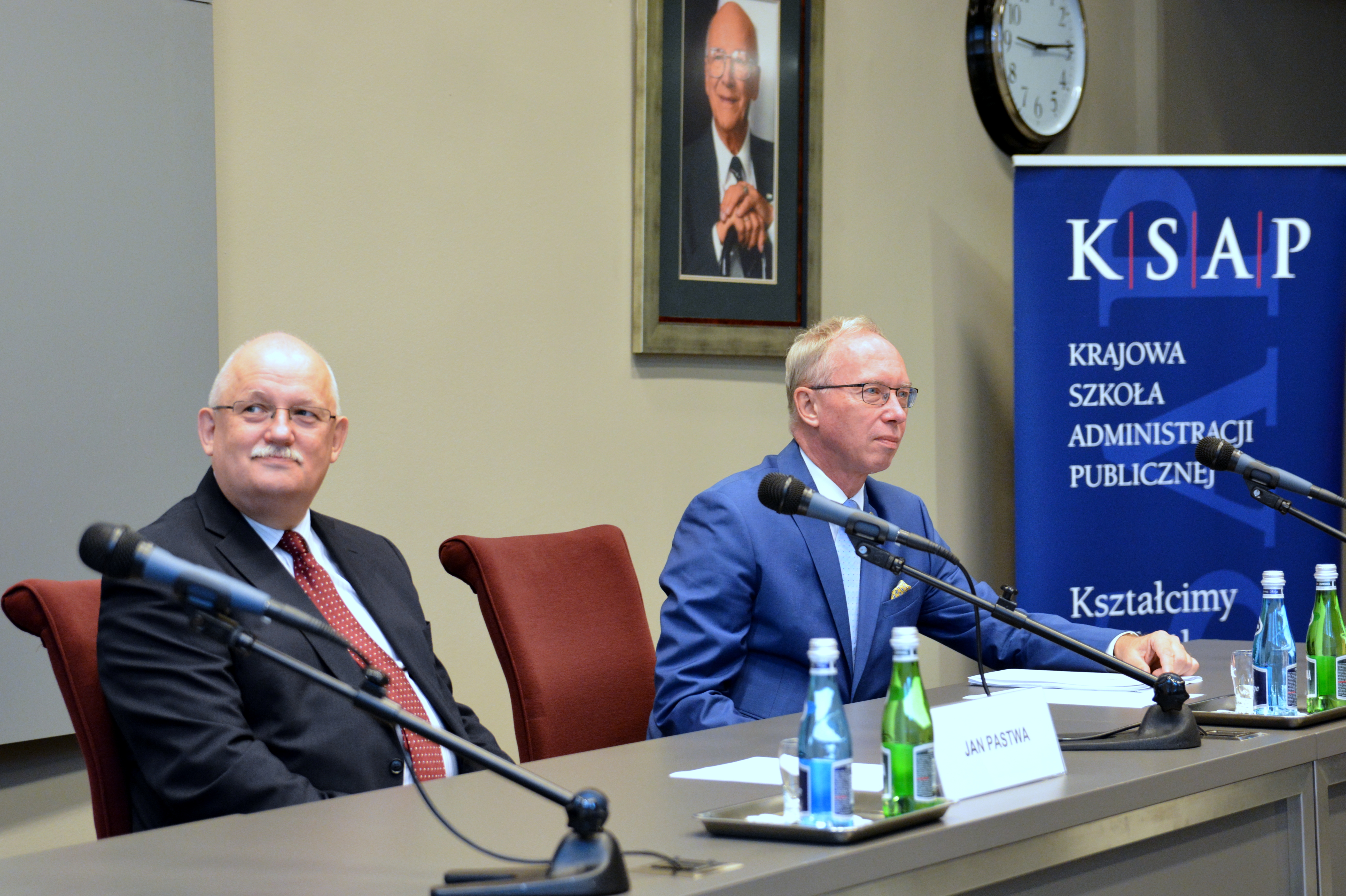 W auli KSAP Wojewoda Mazowiecki Jacek Kozłowski przypina Złoty Krzyż Zasługi Jamesowi Richardsowi. W tle stoi Dyrektor KSAP Jan Pastwa.